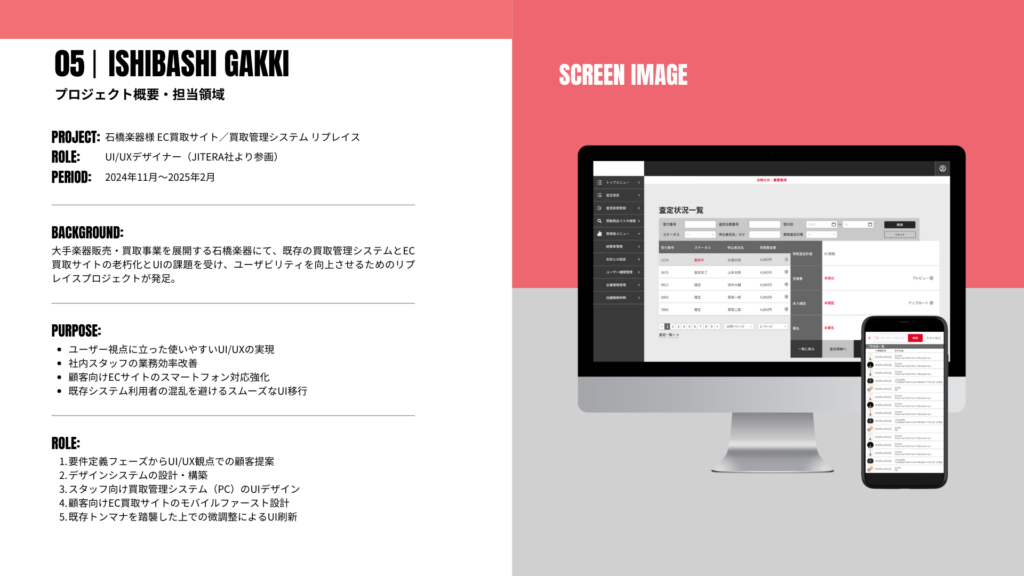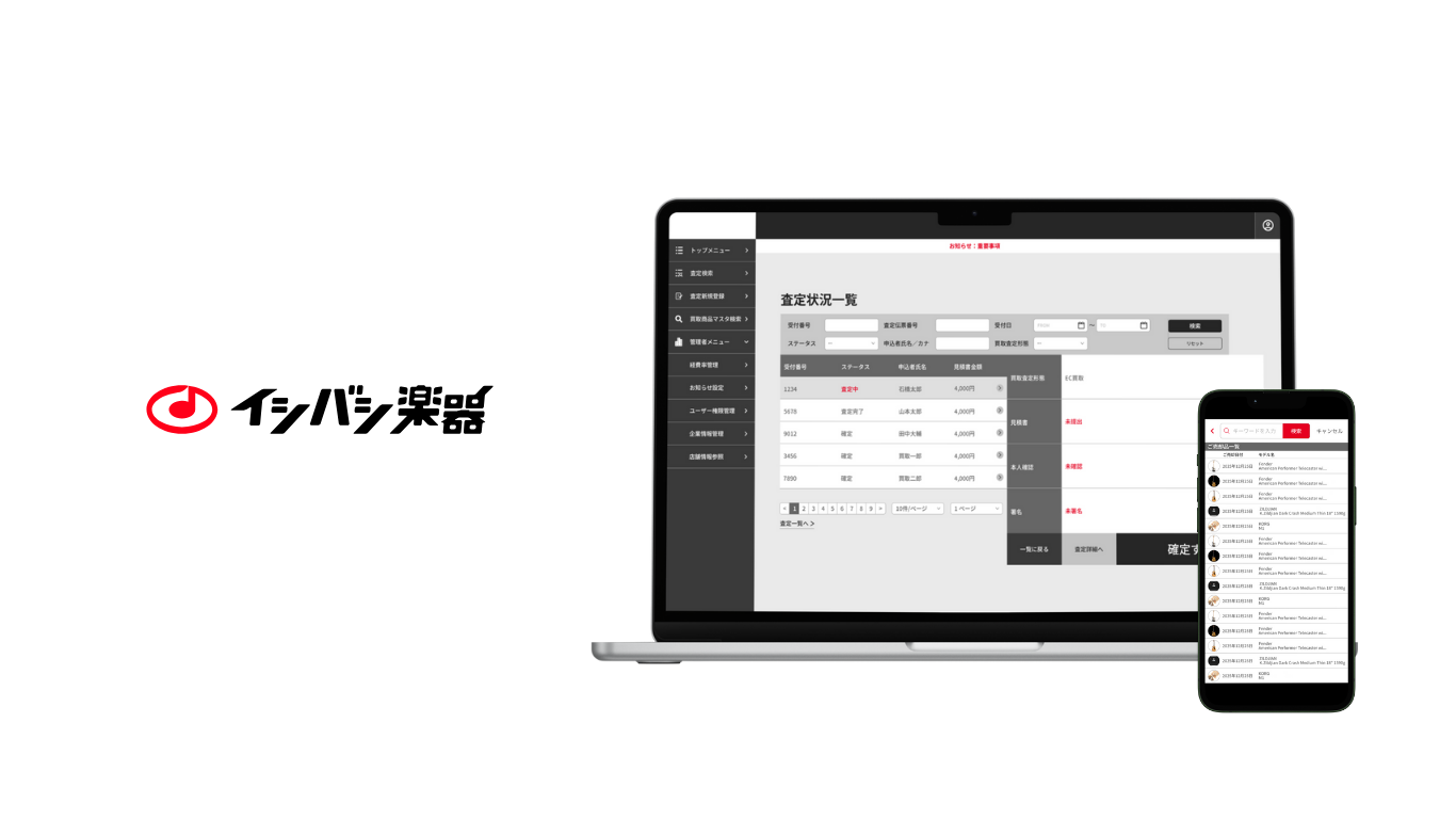 大手楽器販売・買取事業を展開する石橋楽器にて、既存の買取管理システムとEC買取サイトの老朽化とUIの課題を受け、ユーザビリティを向上させるためのリプレイスプロジェクトが発足。