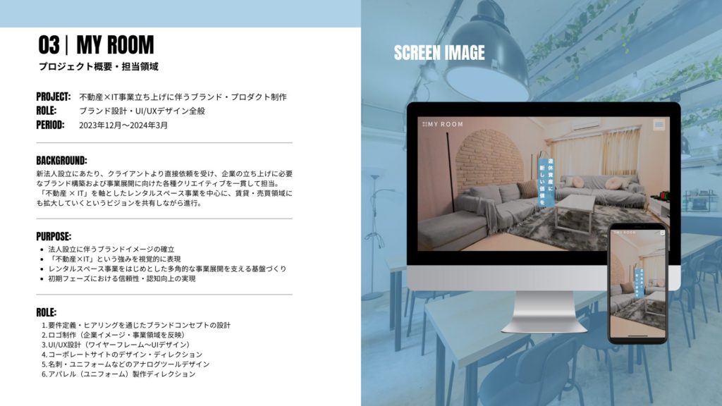 新法人設立にあたり、クライアントより直接依頼を受け、企業の立ち上げに必要なブランド構築および事業展開に向けた各種クリエイティブを一貫して担当。「不動産 × IT」を軸としたレンタルスペース事業を中心に、賃貸・売買領域にも拡大していくというビジョンを共有しながら進行。