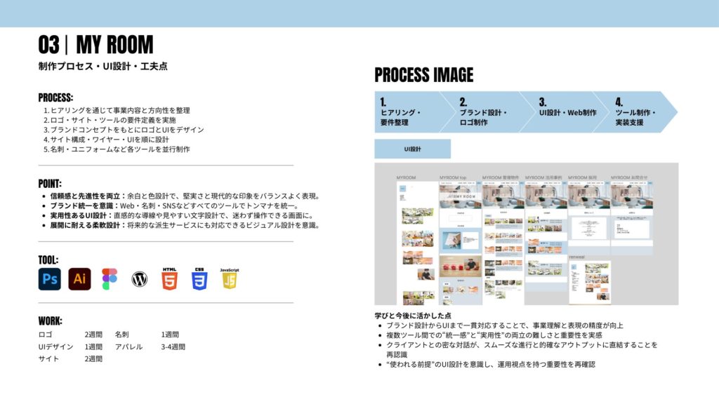 - 展開に耐える柔軟設計:将来的な派生サービスにも対応できるビジュアル設計を意識。